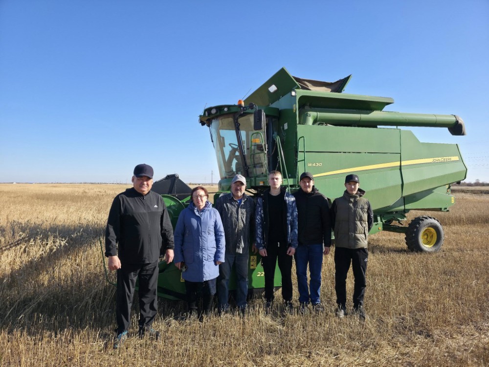 Студенттер далада комбайн жүргізу бойынша тәжірибелік дағдыларын пысықтап, 2025 жылғы өнімнің алғашқы бункер бидайын жинап алды.