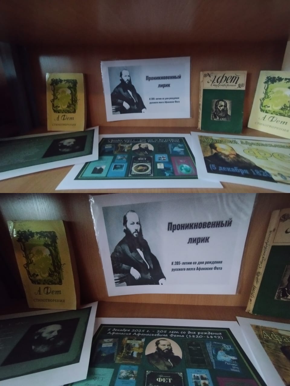 5 желтоқсан күні Новоишим аграрлы-техникалық колледжінде кітапханашы Мамбеталинова Б.А. жетекшілігімен орыс поэзиясының көрнекті өкілі, ақын және аудармашы Афанасий Феттің туғанына 205 жыл толуына арналған «Жан тебірентерлік лирик» атты кітап көрмесі ұйымдастырылды.